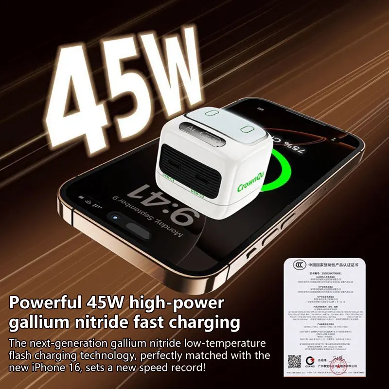 The 45W Gallium Nitride (GaN) Charger with Built-in Touch Light is a unique multi-functional charging solution designed for modern lifestyles. Combining high-speed charging technology with a compact bedside lamp, this device delivers both convenience and performance in one sleek accessory.