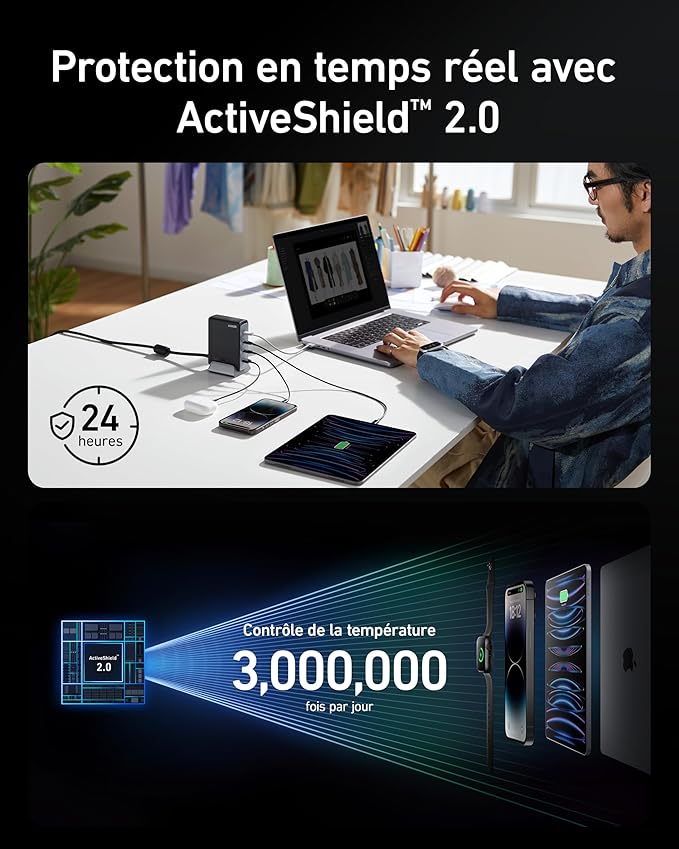 Safety is a top priority with Anker ActiveShield™ 2.0, which monitors temperature 3 million times per day to protect your devices from overheating, overvoltage, and current fluctuations. The smart, removable charging base helps keep your desk clean and organized while delivering maximum power.